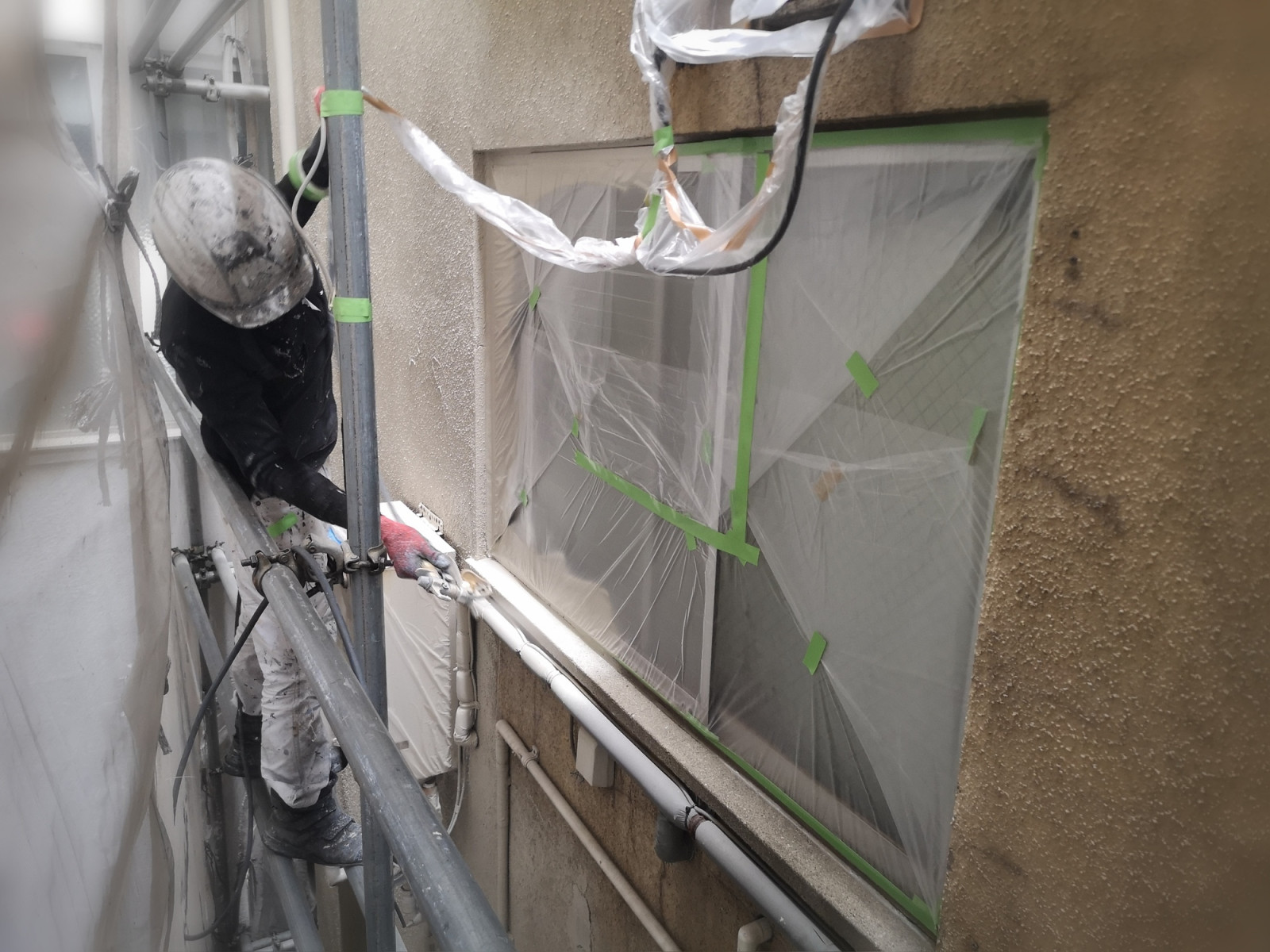 外壁・軒天・鉄鋼部などの広範囲を効率よく塗装。創業当初は吹付塗装を専門としていたため、様々なパターン付け等、技術に自信があります。